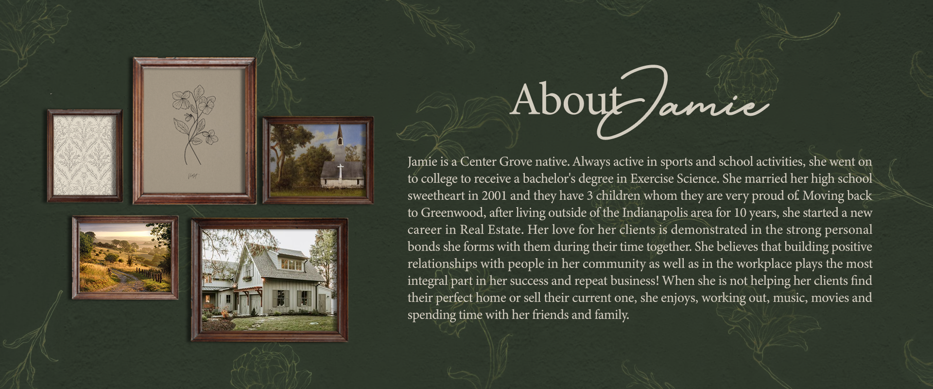 Jamie is a Center Grove native. Always active in sports and school activities, she went on to college to receive a bachelor's degree in Exercise Science. She married her high school sweetheart in 2001 and they have 3 children whom they are very proud of. Moving back to Greenwood, after living outside of the Indianapolis area for 10 years, she started a new career in Real Estate. Her love for her clients is demonstrated in the strong personal bonds she forms with them during their time together. She believes that building positive relationships with people in her community as well as in the workplace plays the most integral part in her success and repeat business! When she is not helping her clients find their perfect home or sell their current one, she enjoys, working out, music, movies and spending time with her friends and family.